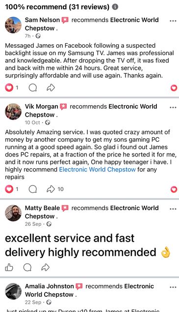 “Fantastic service I rang Electronic World this morning and they came straight out within an hour of ringing. I had a problem with my Samsung smart TV not turning on it turned out I had a power problem with it and james repaired it at my home within 20 minutes great guy that knows his stuff highly recommended”