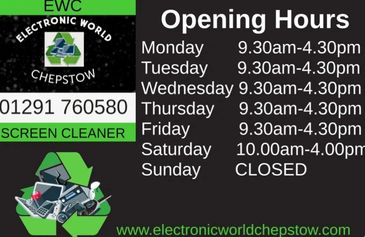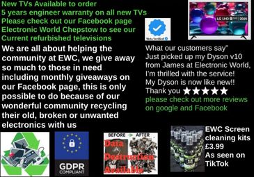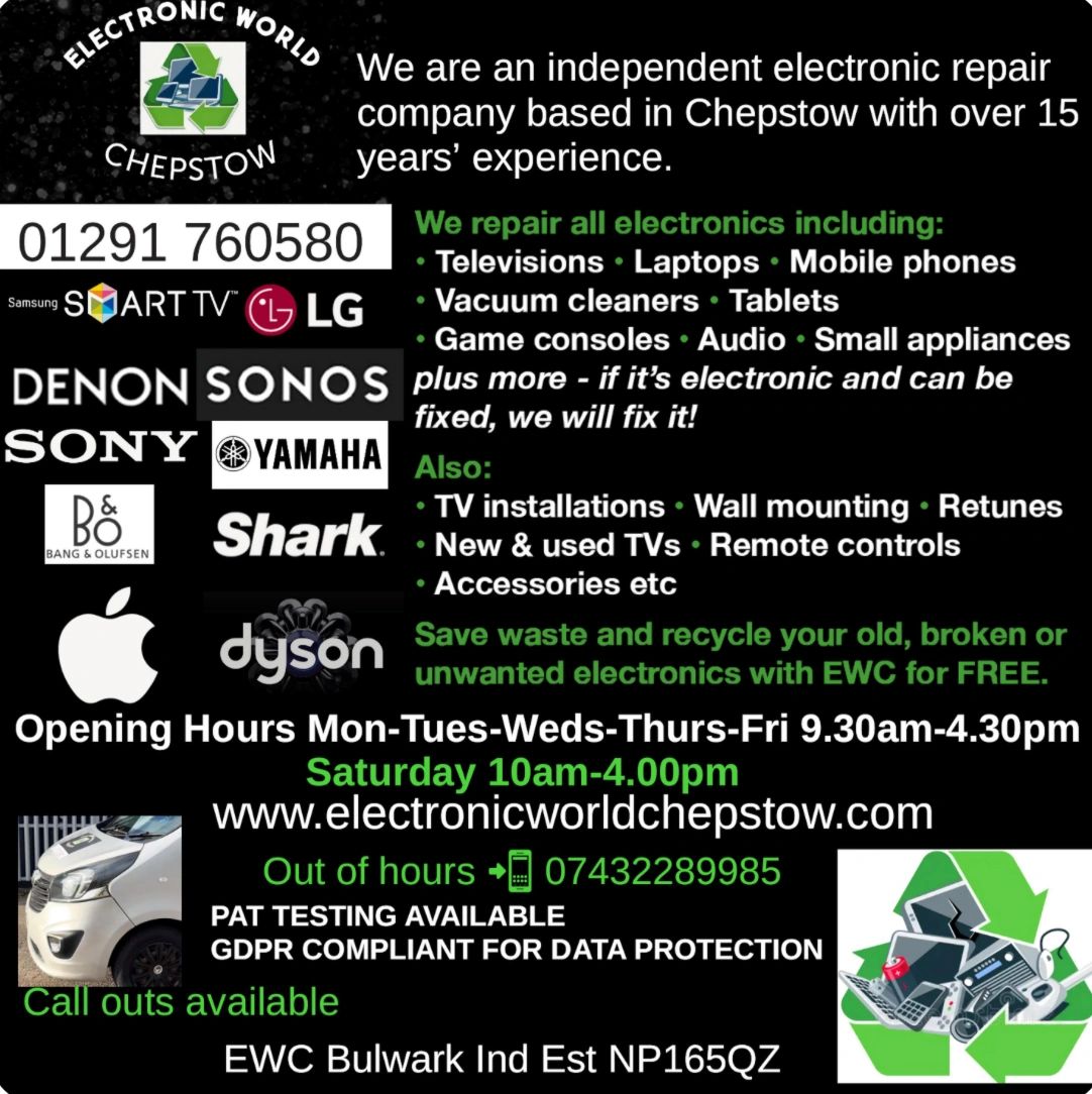 Electronic World Chepstow offers a range of sales, repairs, installations, and recycling services for various electronic items.