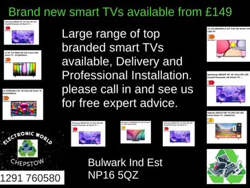 At Electronic World Chepstow we have a large range of brand new smart televisions available to order. These are all top branded TVs including Samsung, Sony & LG. They come with a 5 years warranty.